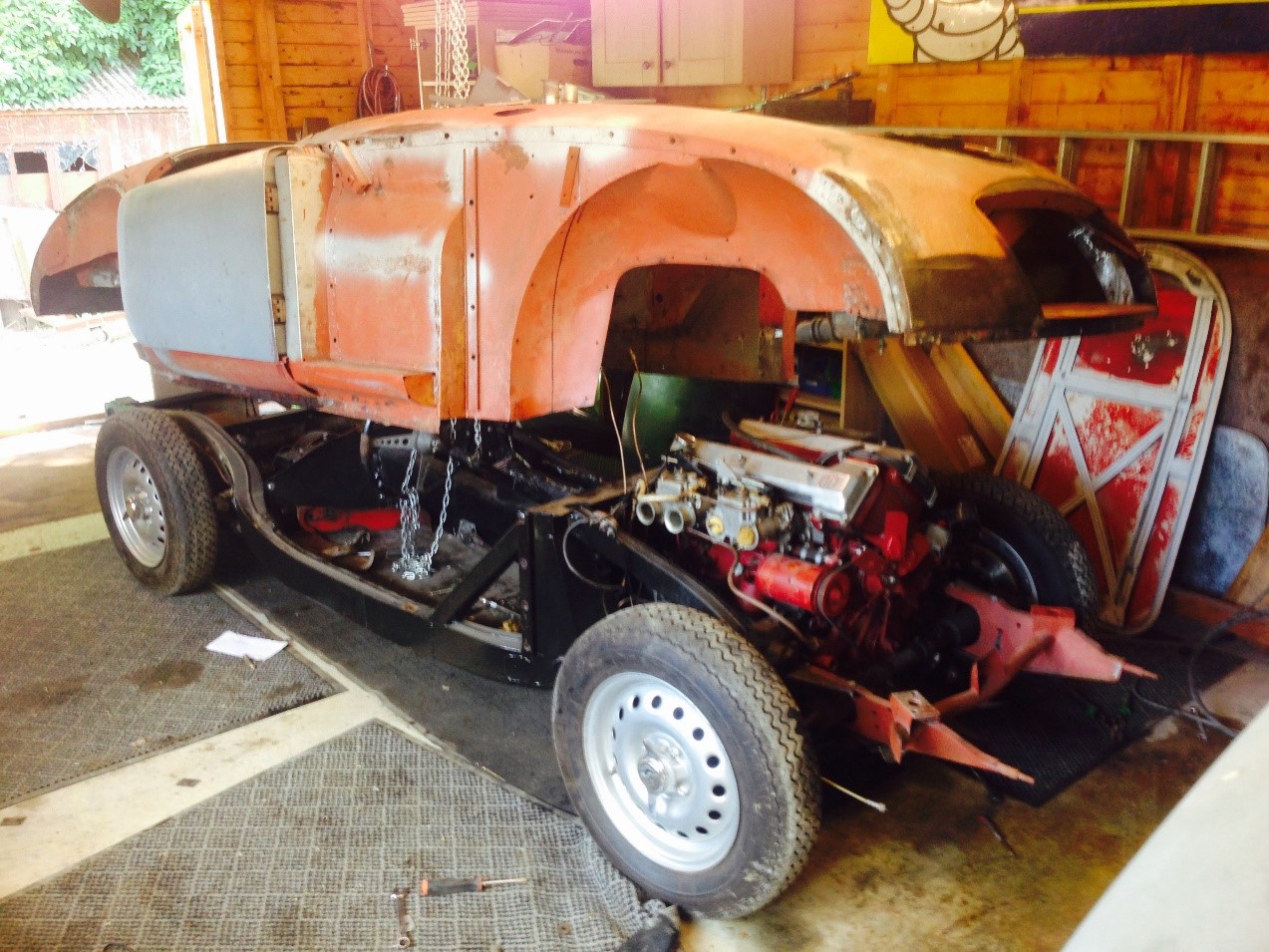 The body tub had to have some welding and repairs before it could be sent away for paint. As a final check for fit, the body was lowered onto the completed chassis to check everything was in the correct alignment before finally being removed and placed onto a specialist jig for paint.