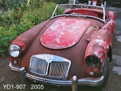 1958 MGA Twin Cam roadster. Orient red with red interior and black roof.